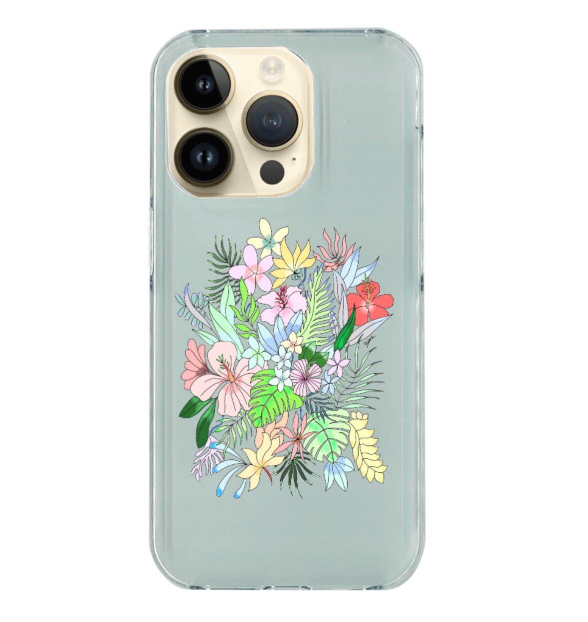 透明でフラワーデザインが施されたiPhone 13用のケースです。美しい花々があなたの大切なスマートフォンを彩ります。透明素材なので、iPhone本来のデザインや色味を損なわずに、おしゃれなアクセントを加えることができます。